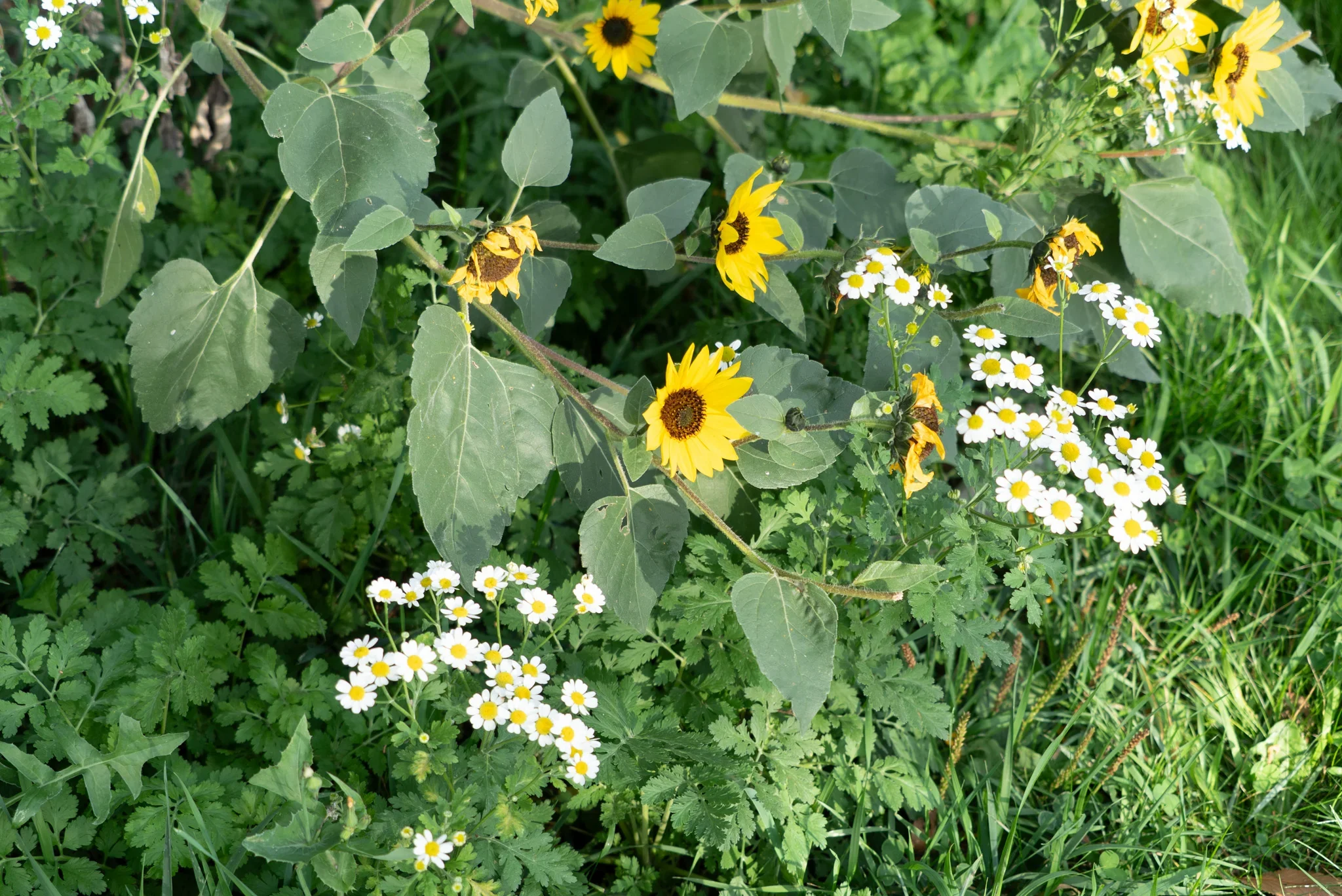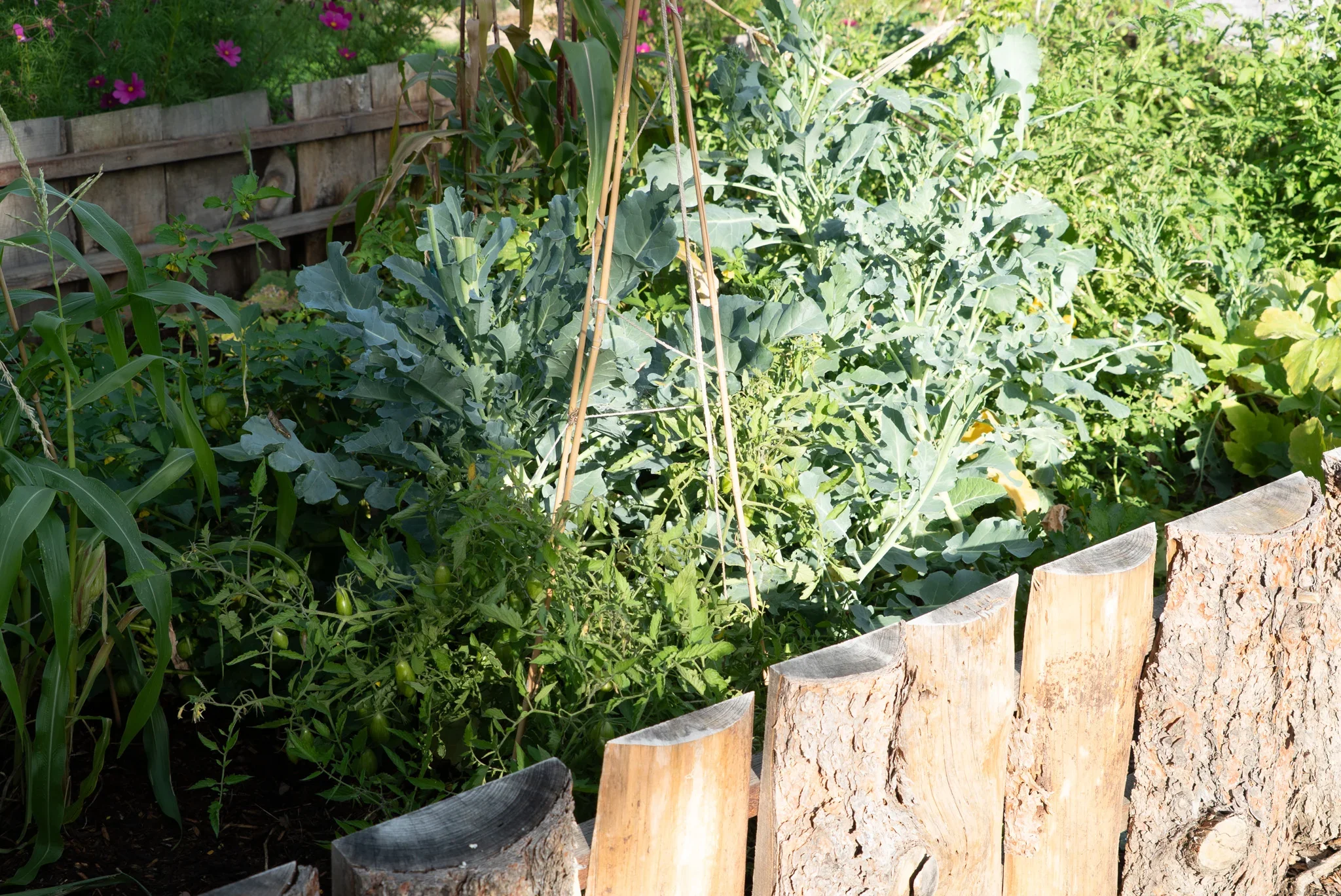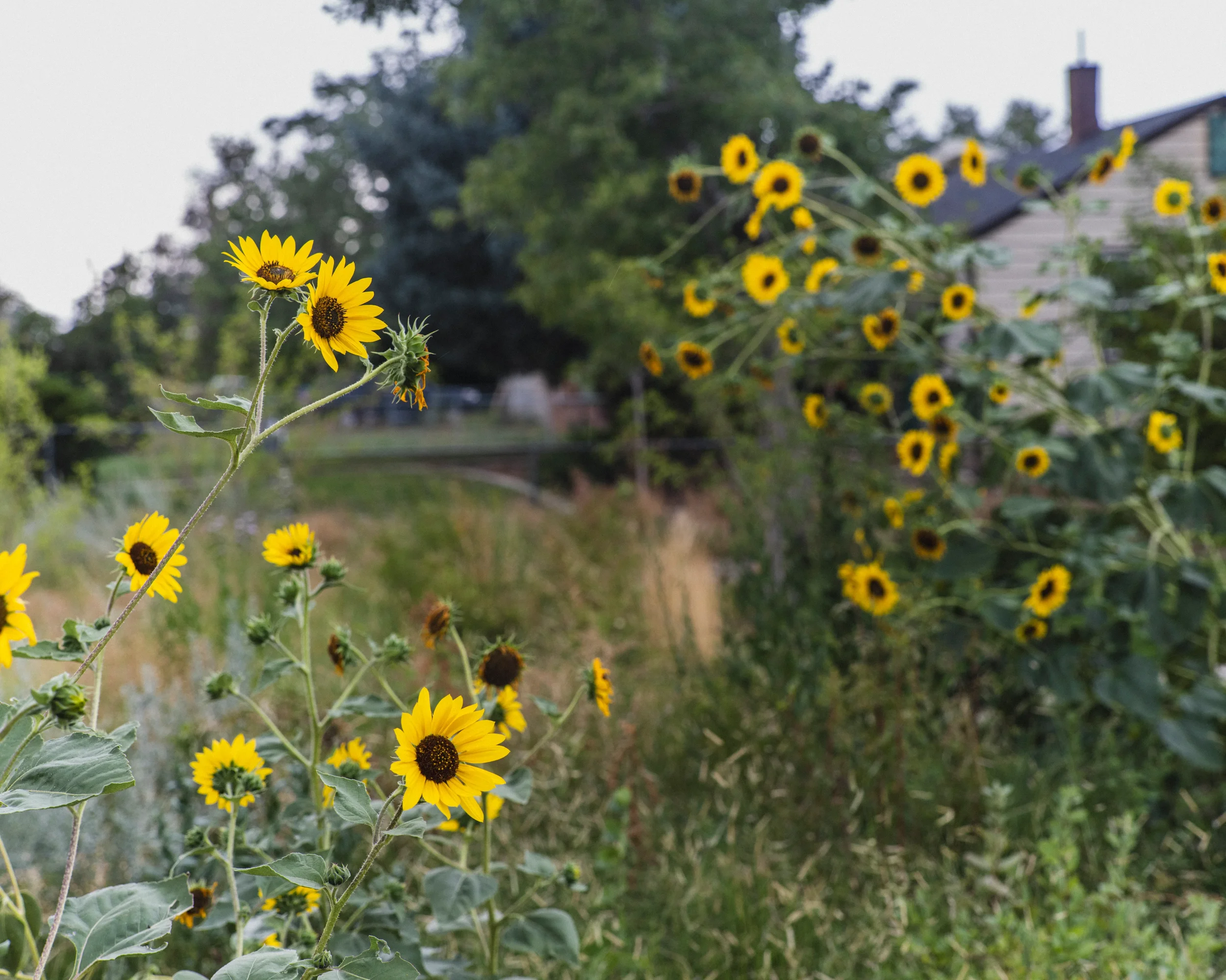A vegetable garden, with broccoli, corn, tomatoes, peppers, tomatillos, lettuce, lima beans, and radishes, provides sustenance throughout the summer season. Fence was designed and fabricated by Chad from offcuts of pine from another install. Volunteer native sunflowers, Helianthus annus, grow alongside medicinal Feverfew, Tanacetum parthenium, in a quiet back corner.