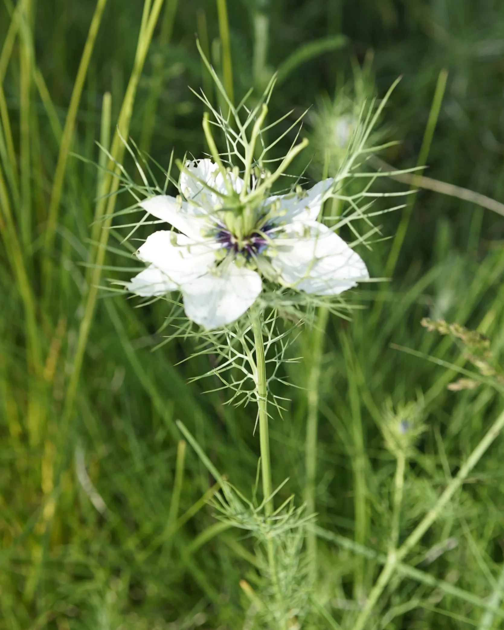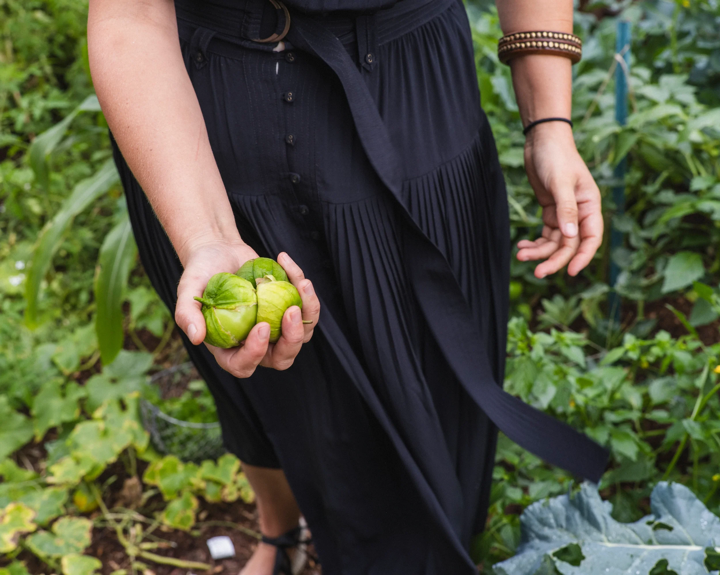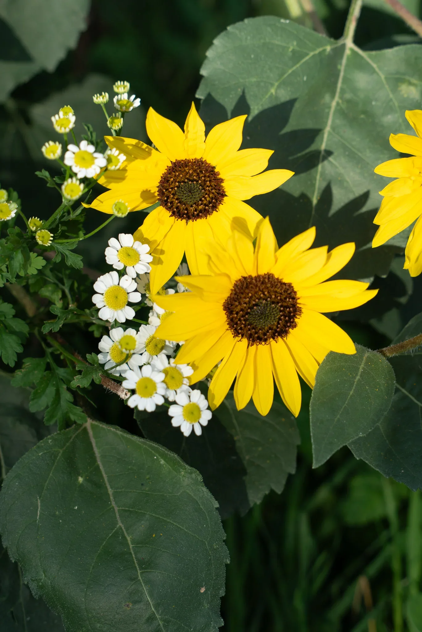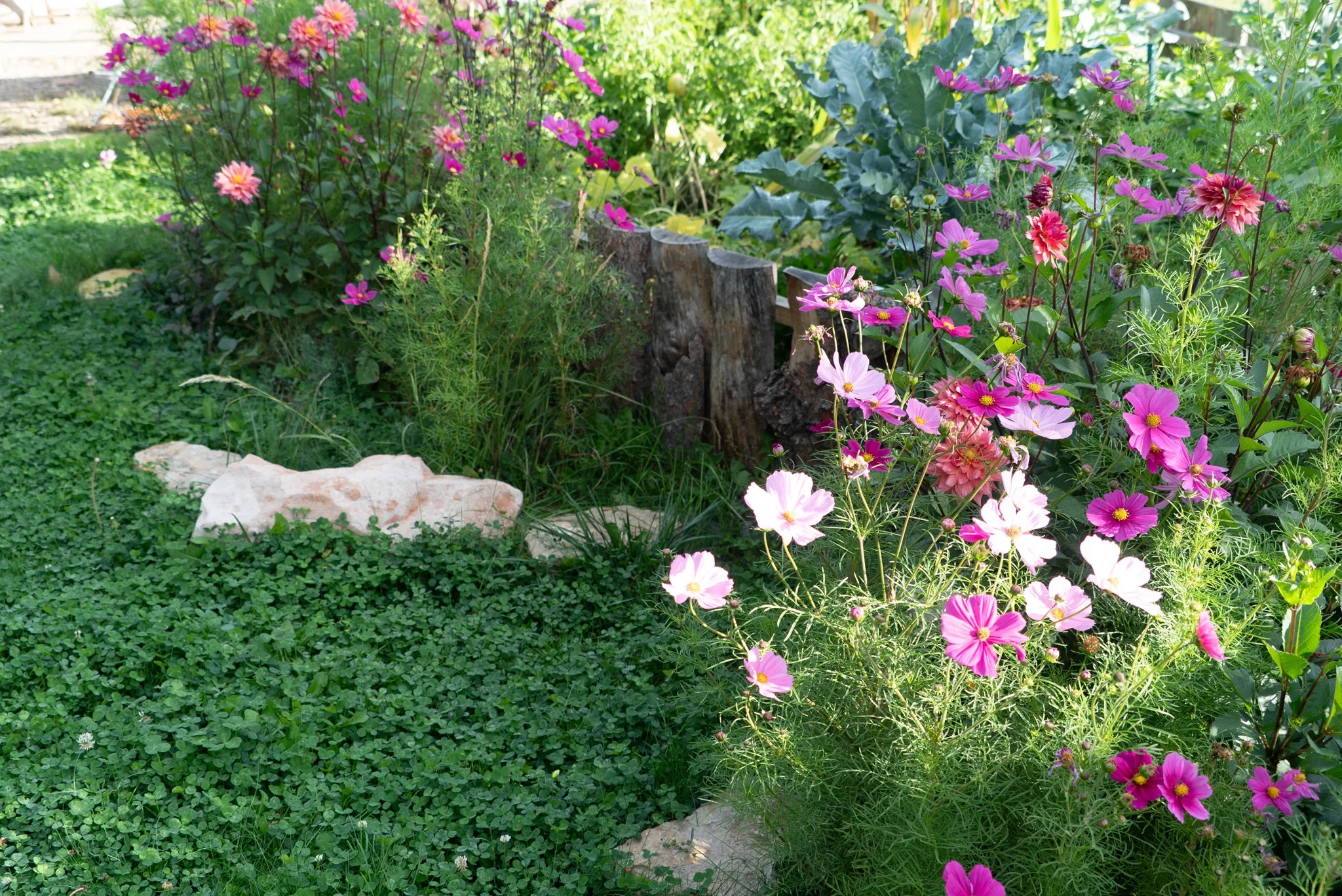 A vegetable garden, with broccoli, corn, tomatoes, peppers, tomatillos, lettuce, lima beans, and radishes, provides sustenance throughout the summer season. Fence was designed and fabricated by Chad from offcuts of pine from another install. Volunteer native sunflowers, Helianthus annus, grow alongside medicinal Feverfew, Tanacetum parthenium, in a quiet back corner.