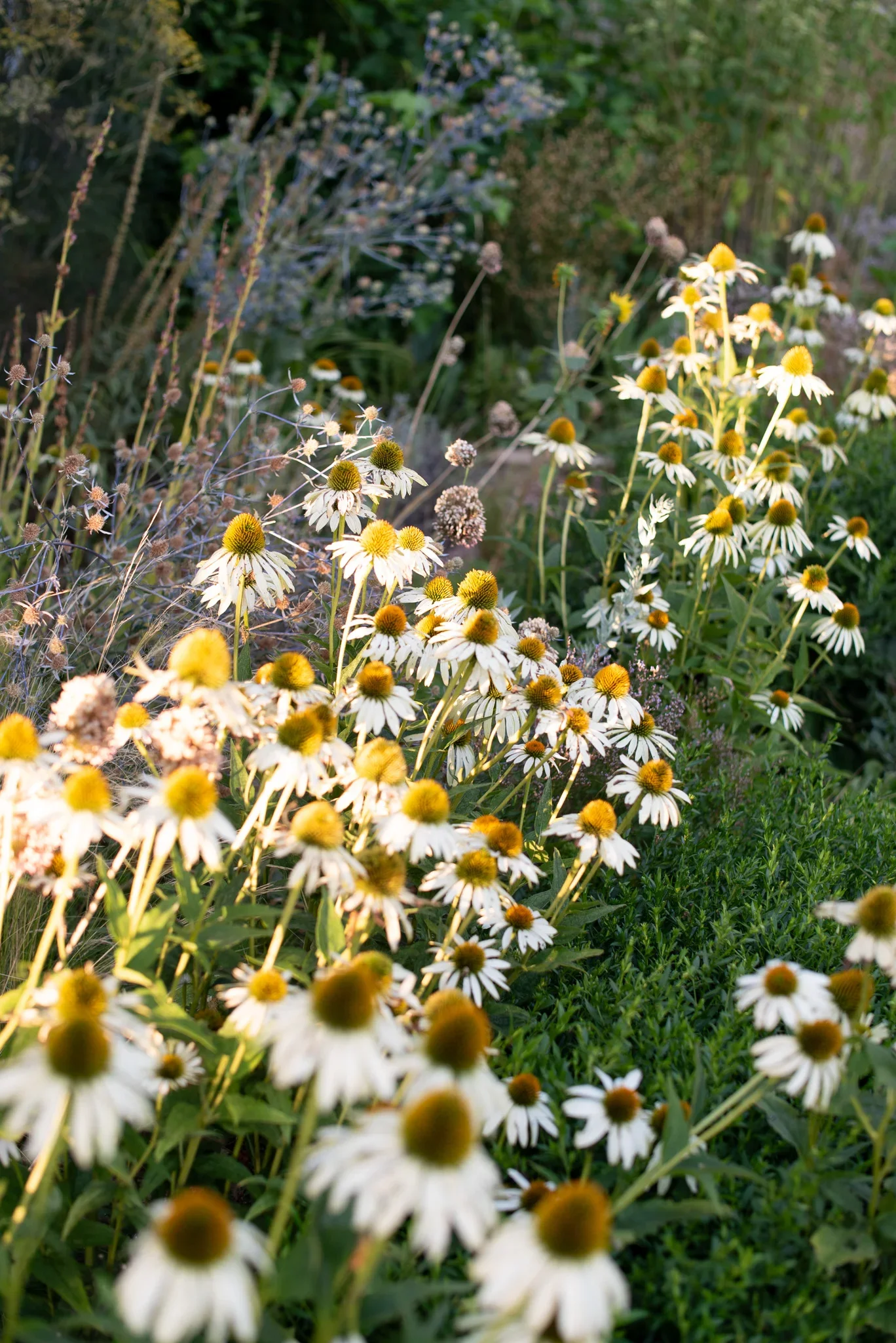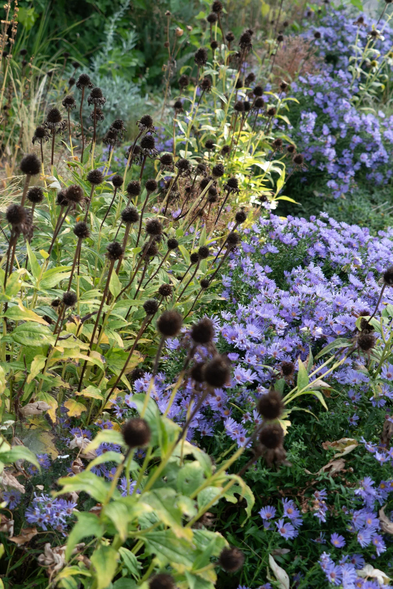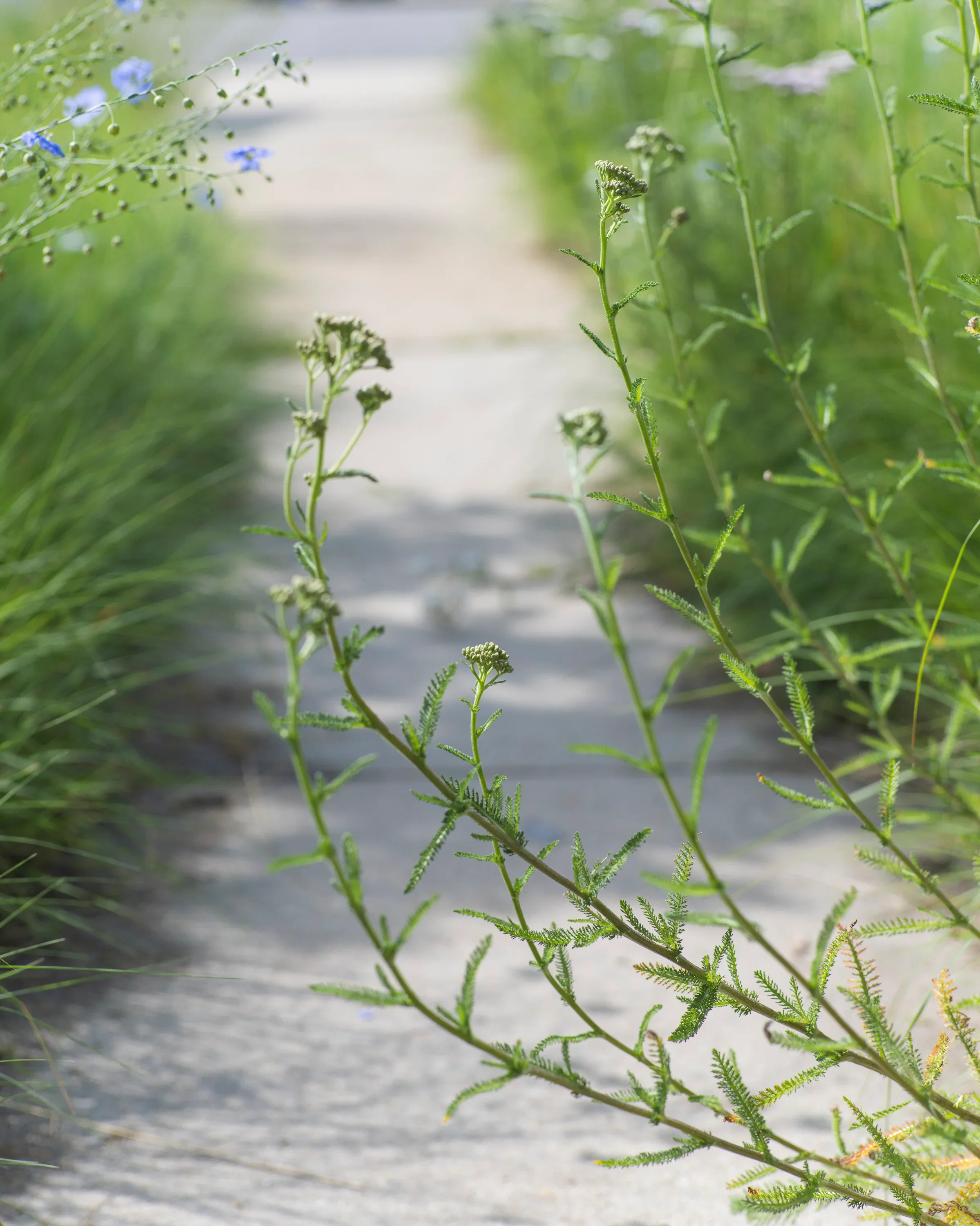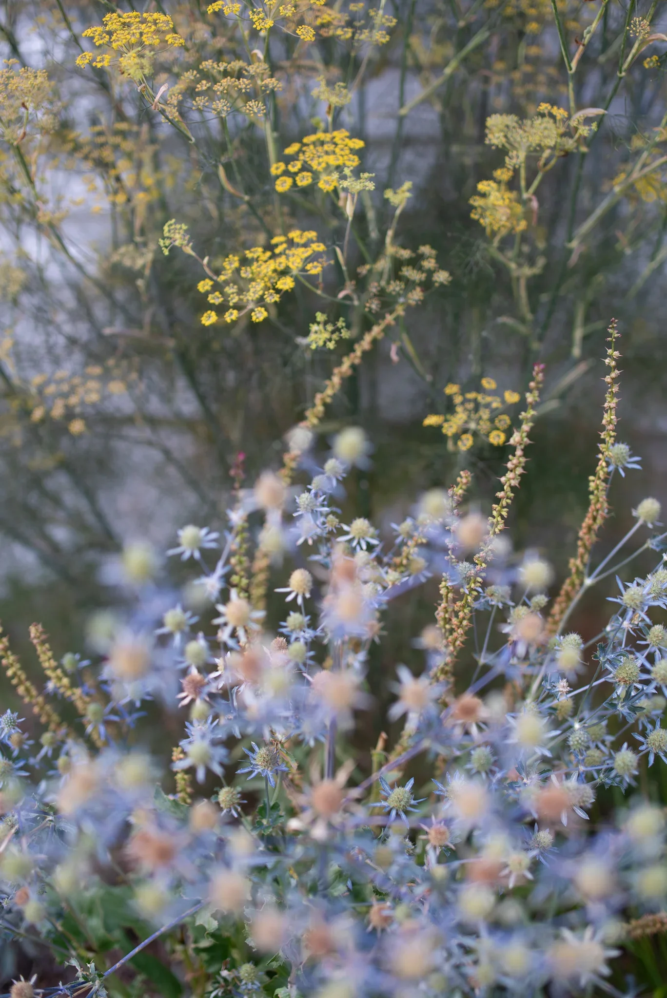 The gravel garden shifts in color palette across the seasons with ephemeral stars, such as Foeniculum vulgare 'Purpureum', Eriogonum umbellatum var. aureum 'Psdowns', and Eryngium planum ‘Blaukappe’.