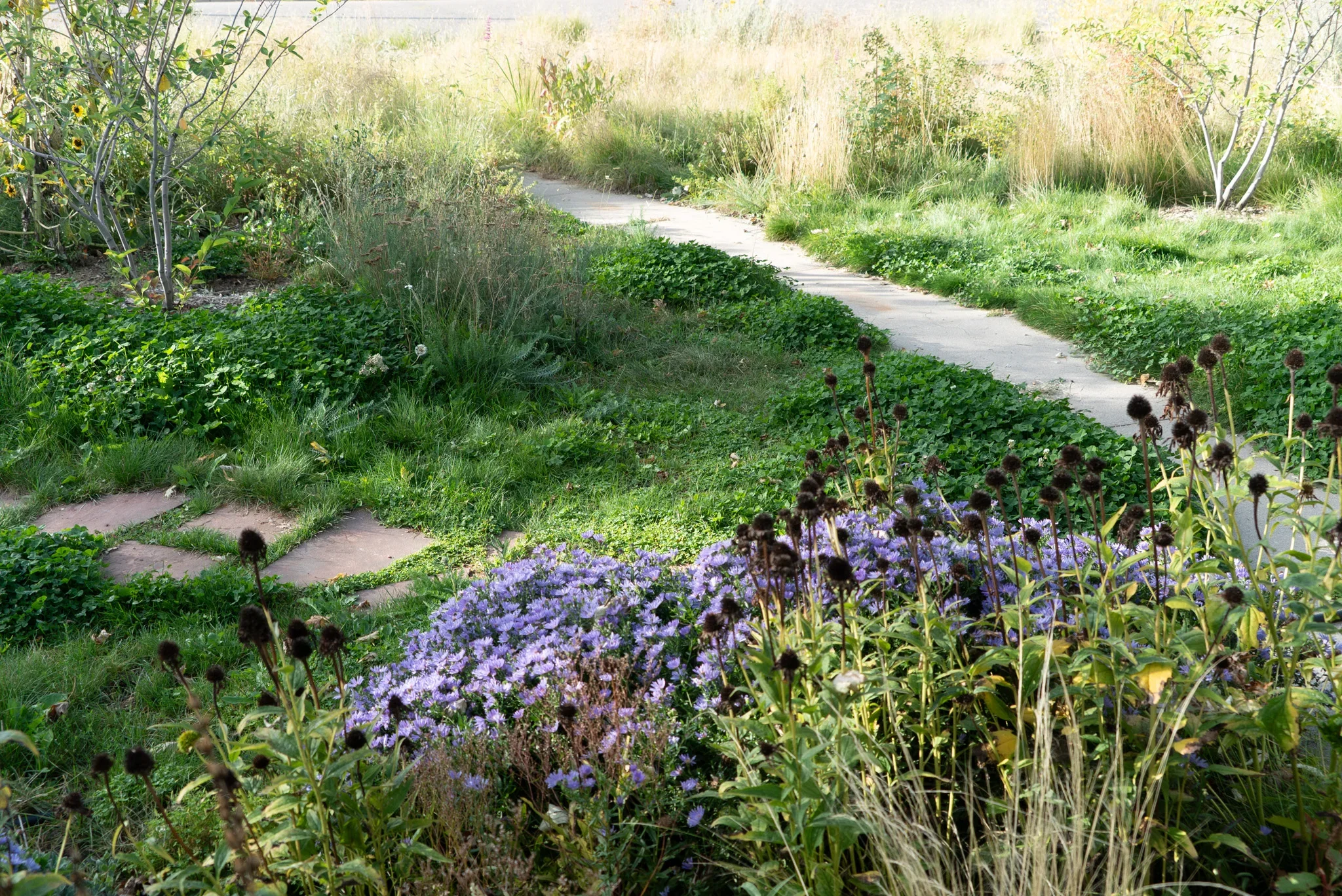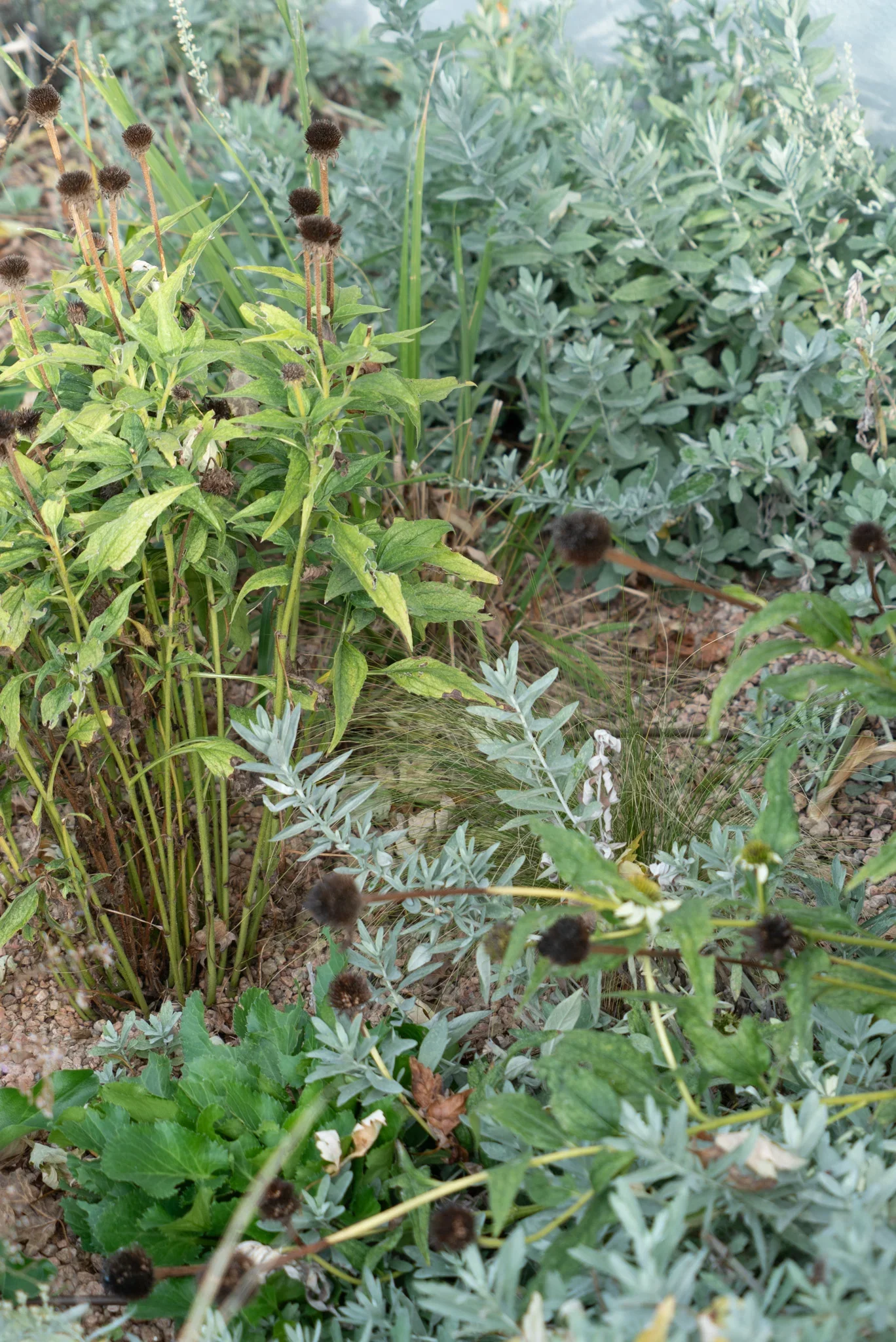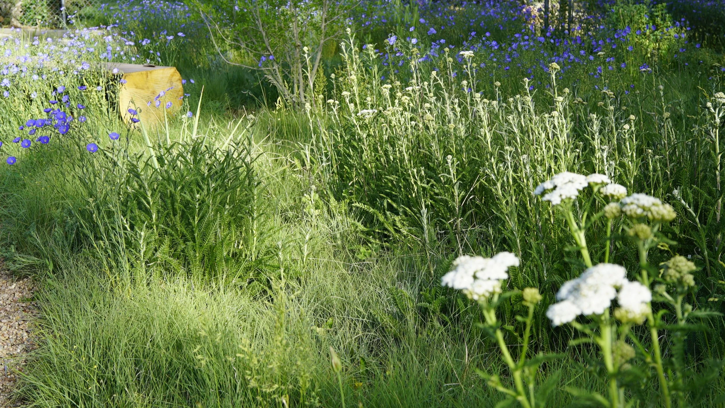 The front meadow and pollinator hedge is composed of over 50 species and was largely established from seed. The species are over 90% native and low water with seasonal superblooms of Linus lewisii, Bouteloua gracilis, and Agatache cana, among others.