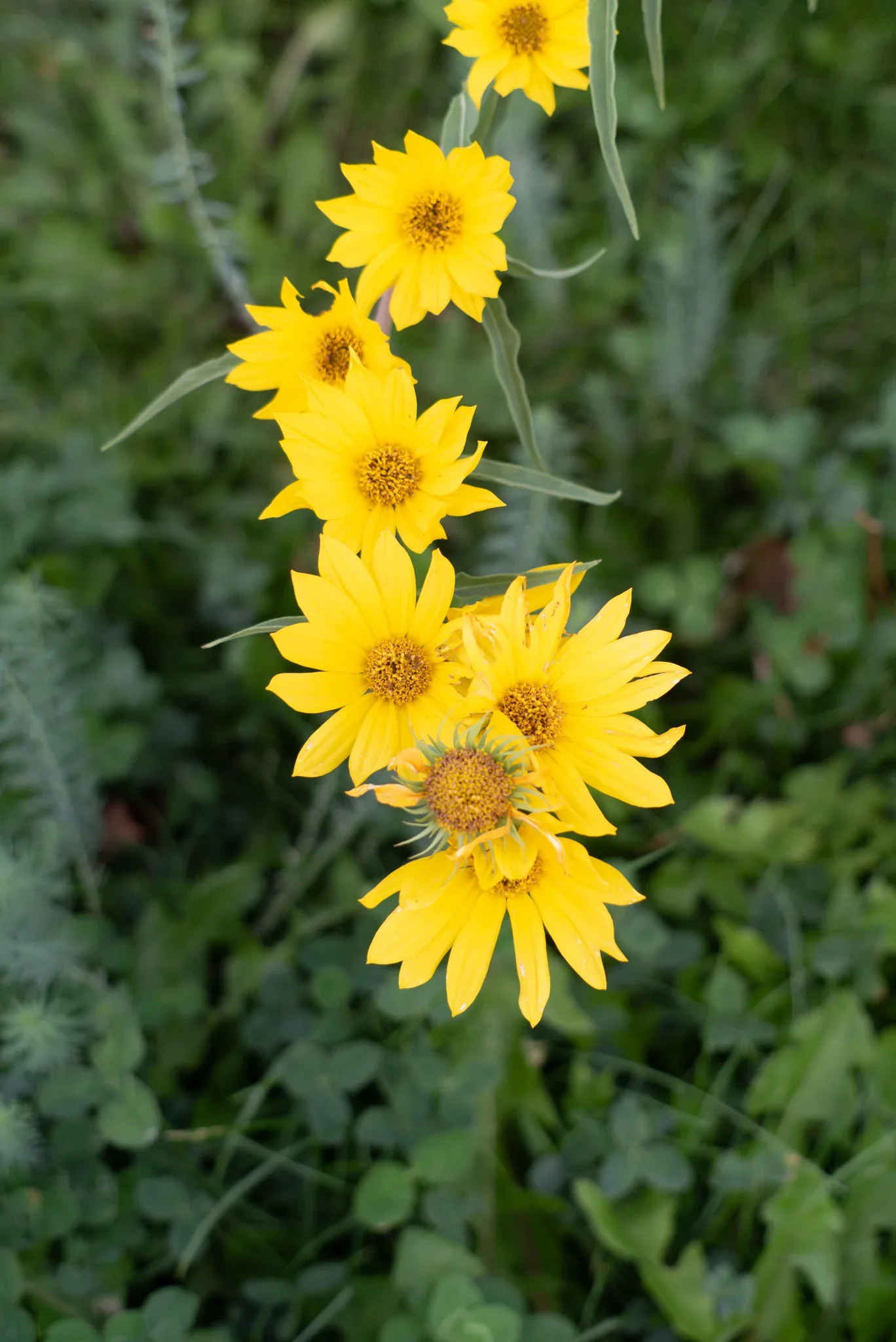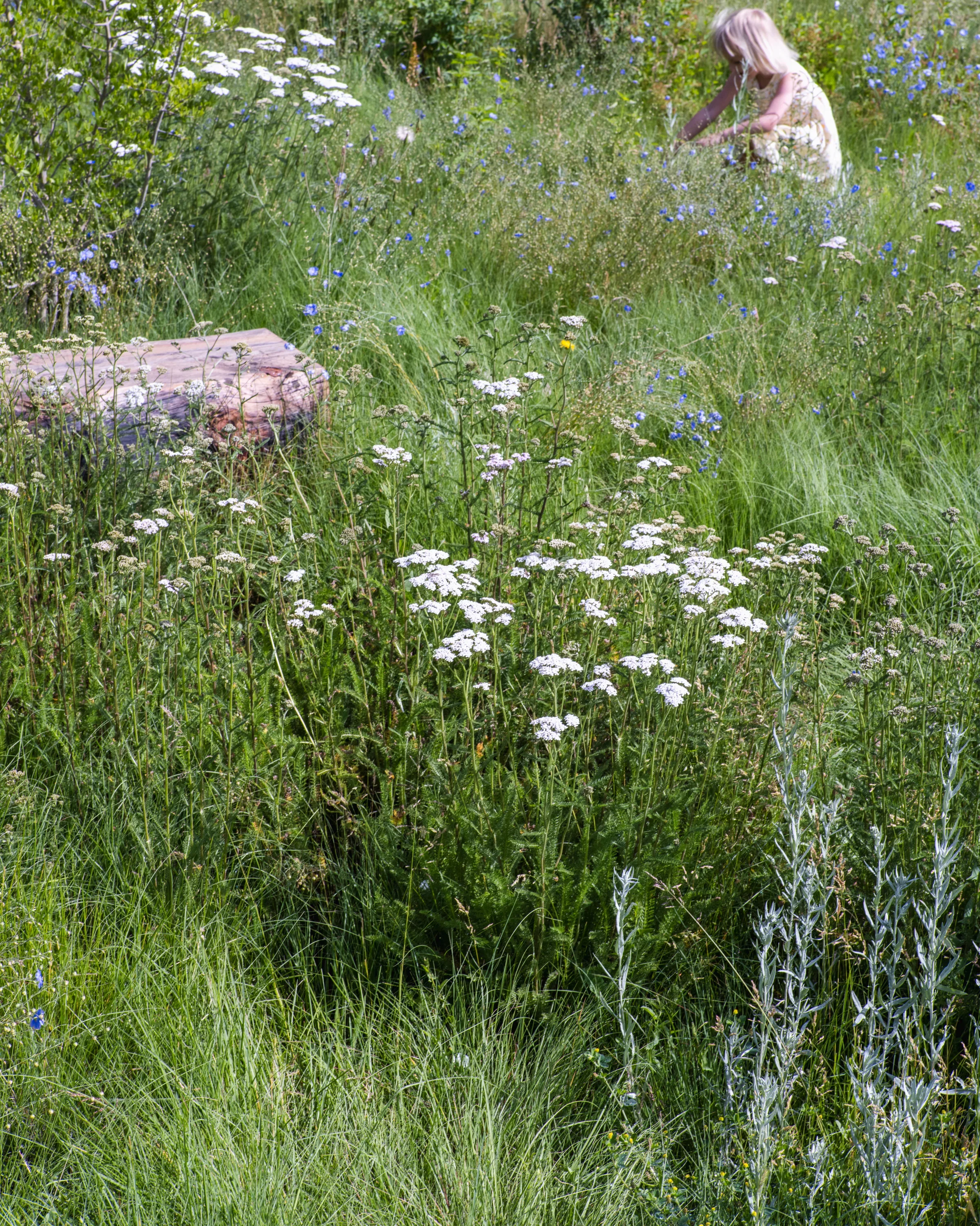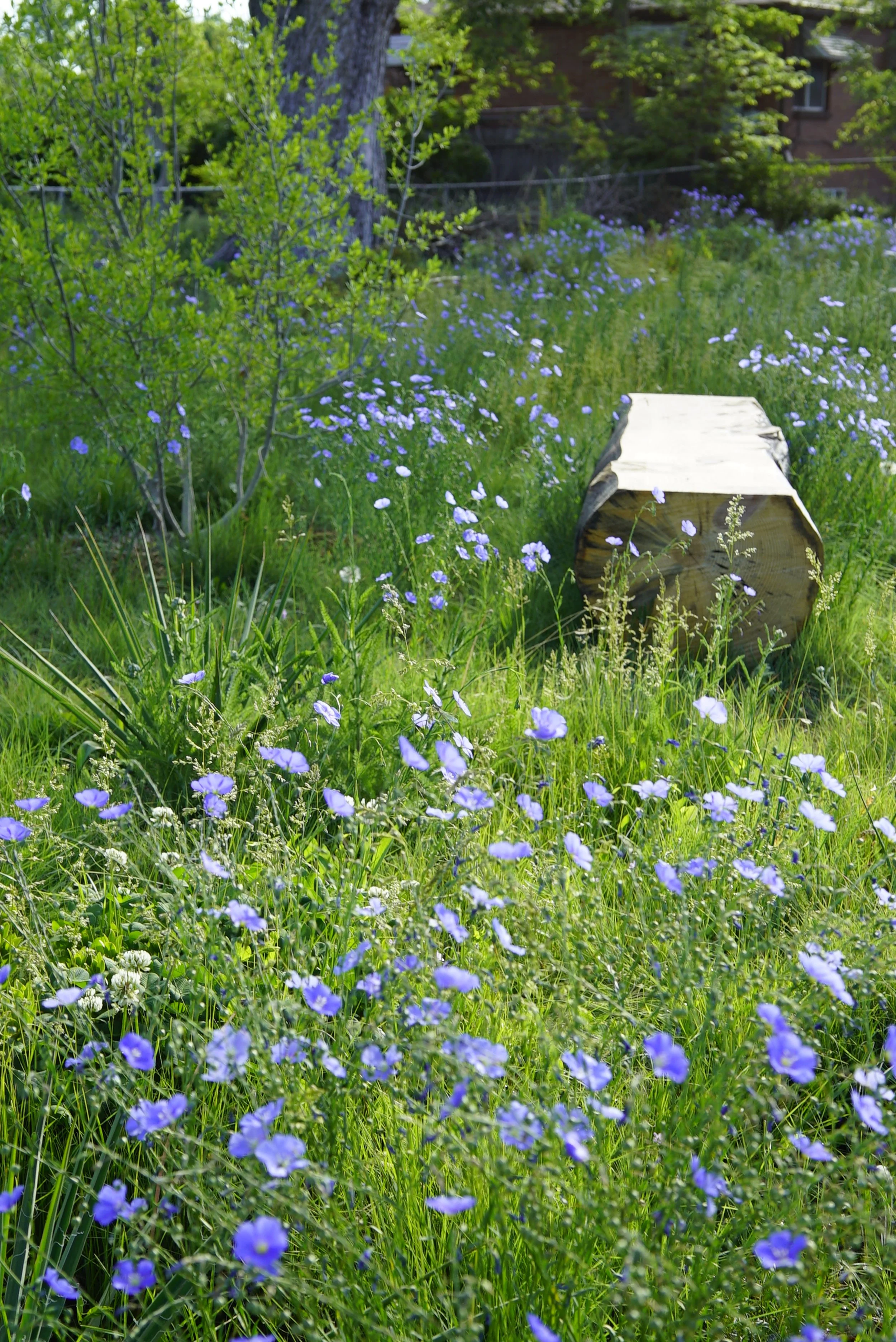 The front meadow and pollinator hedge is composed of over 50 species and was largely established from seed. The species are over 90% native and low water with seasonal superblooms of Linus lewisii, Bouteloua gracilis, and Agatache cana, among others.