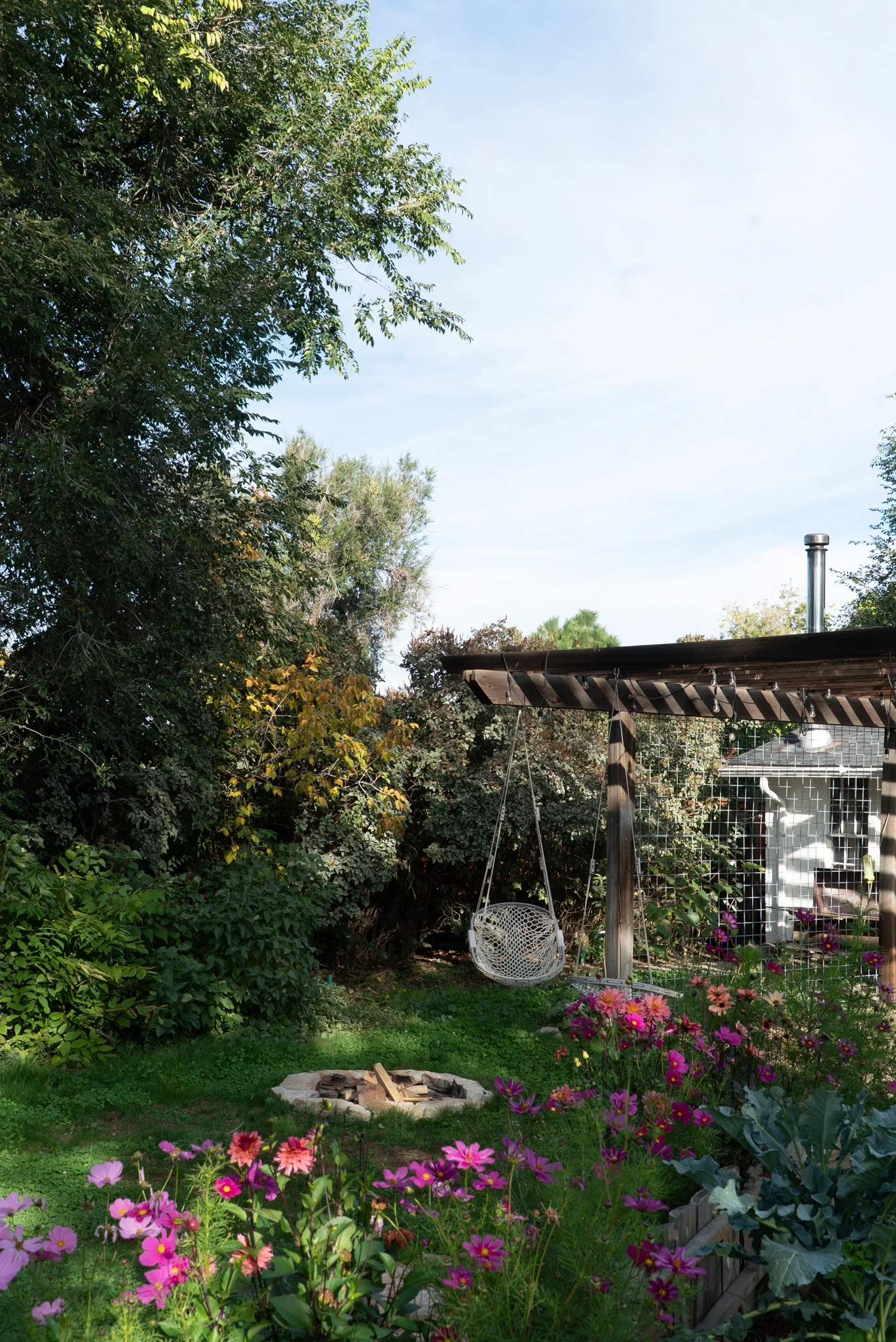 The back garden centers on the Campo shop, housed in an outbuilding at the back of the property. A hammock chair hangs from the corner of a pergola, flanked by a pear and peach tree with grapes working their way up the hog panel trellis. The fie pit is surrounded by a no mow fescue and clover lawn with ornamental black dahlias and cosmos benefitting from the the overspray of the vegetable garden.