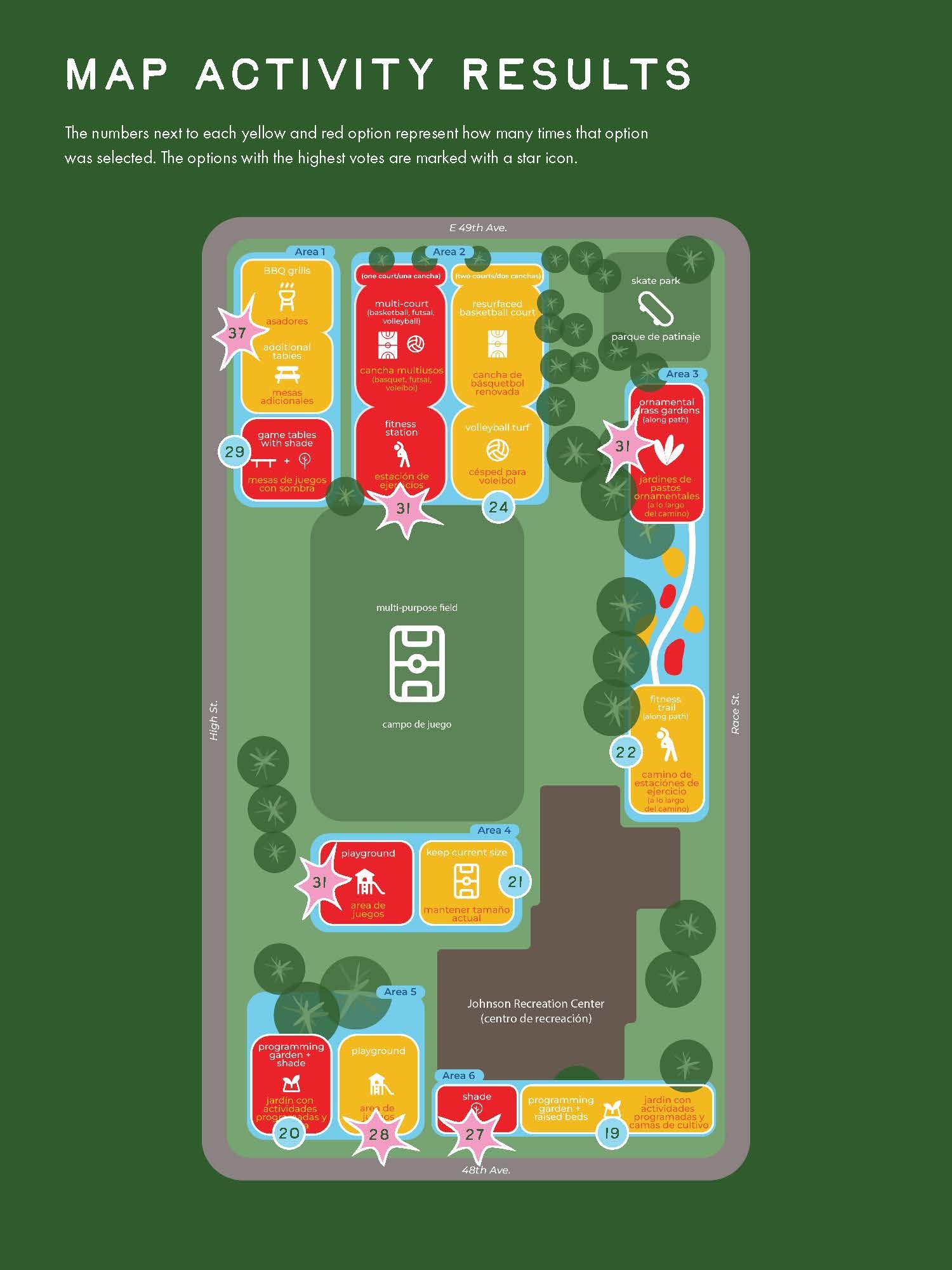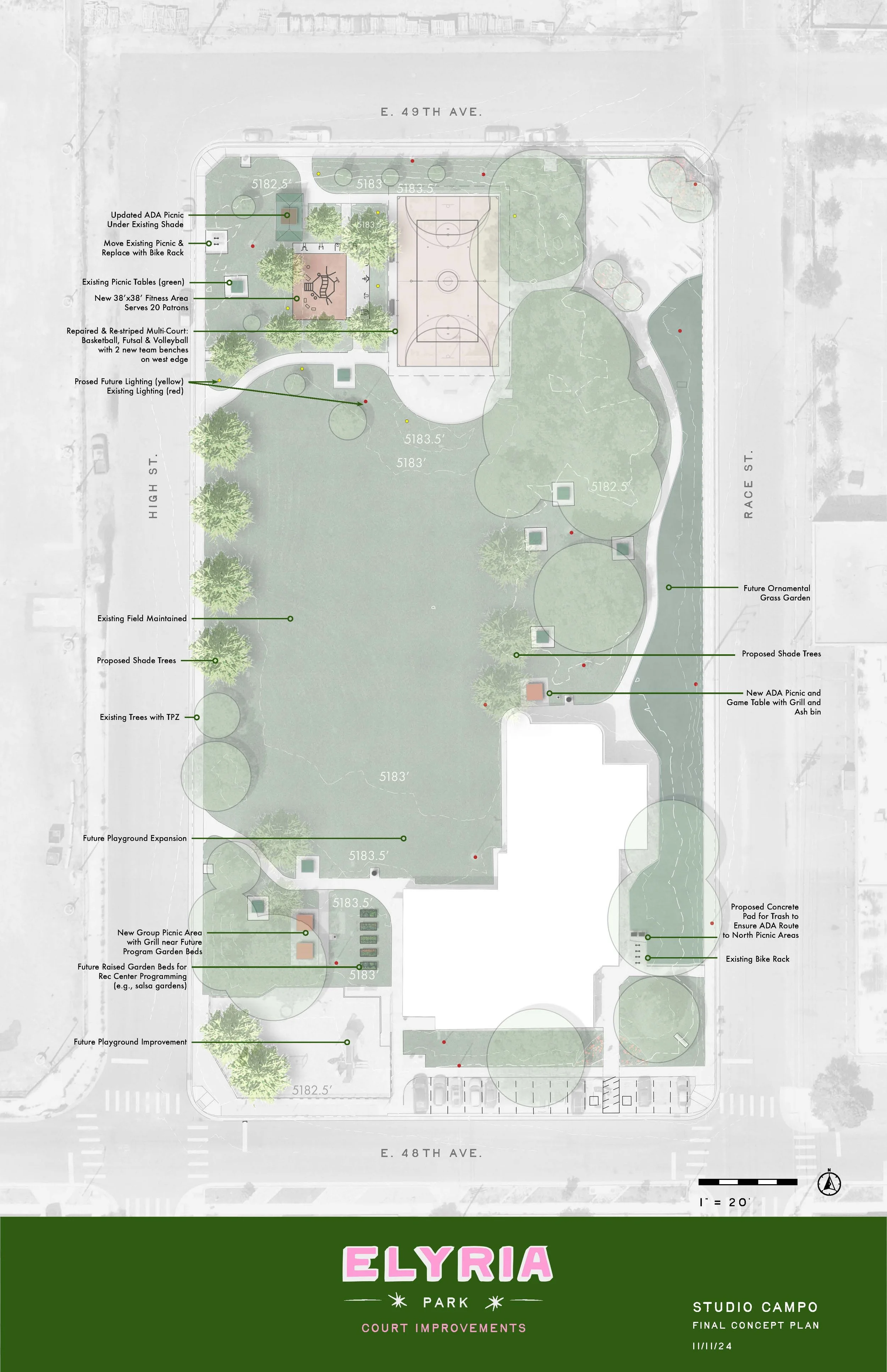 Denver Parks and Recreation (DPR), in collaboration with Studio Campo and Radian, is working on court improvements, additional shade trees, and new fitness equipment for Elyria Park. The Elyria-Swansea community provided guidance on the park’s enhancements. The goal of the project is to honor the diversity and creativity of Elyria residents by incorporating their feedback into the park’s design.