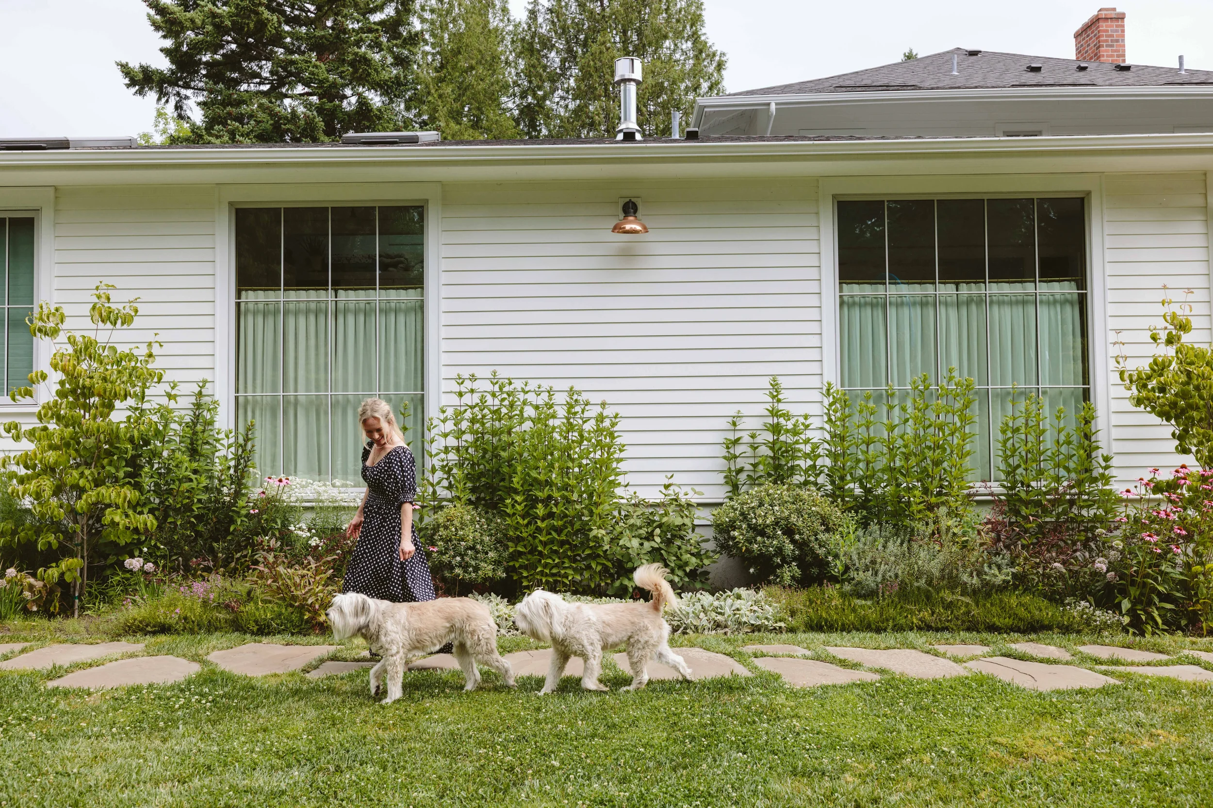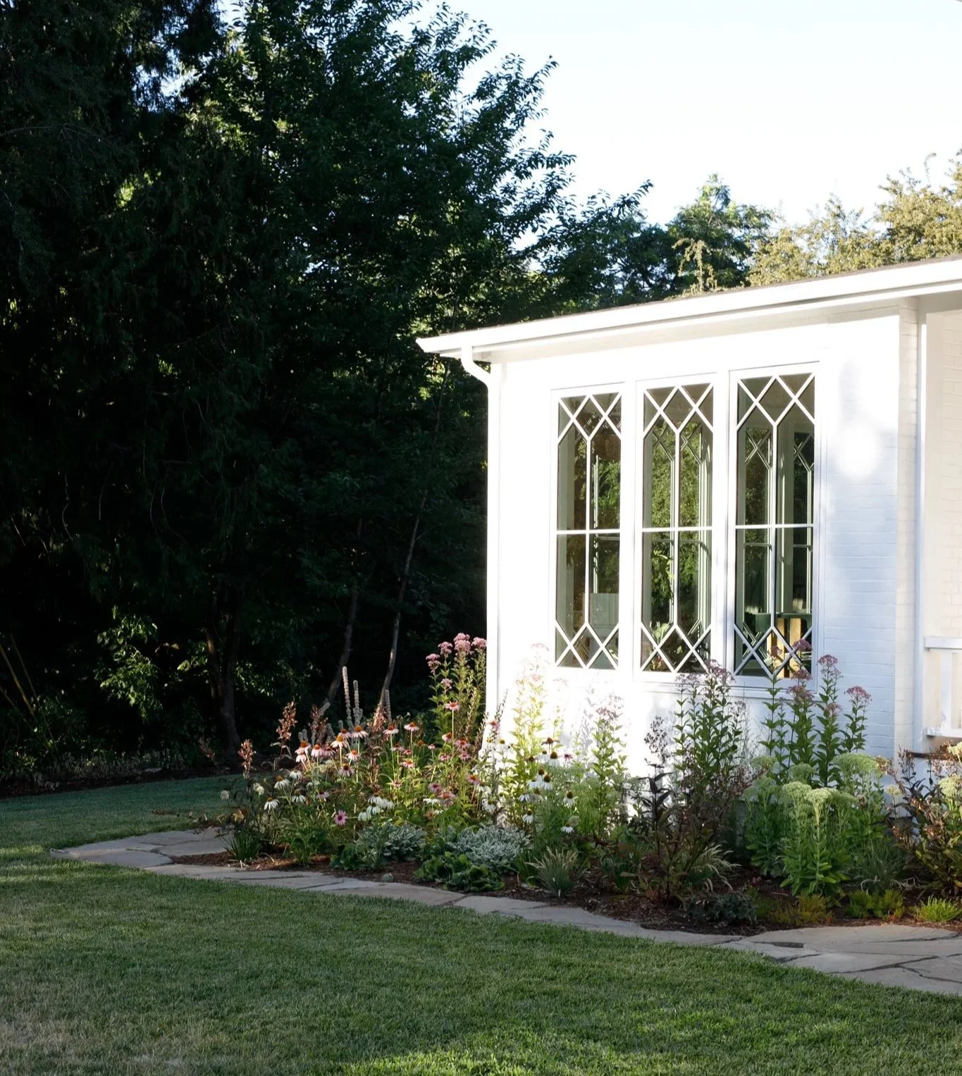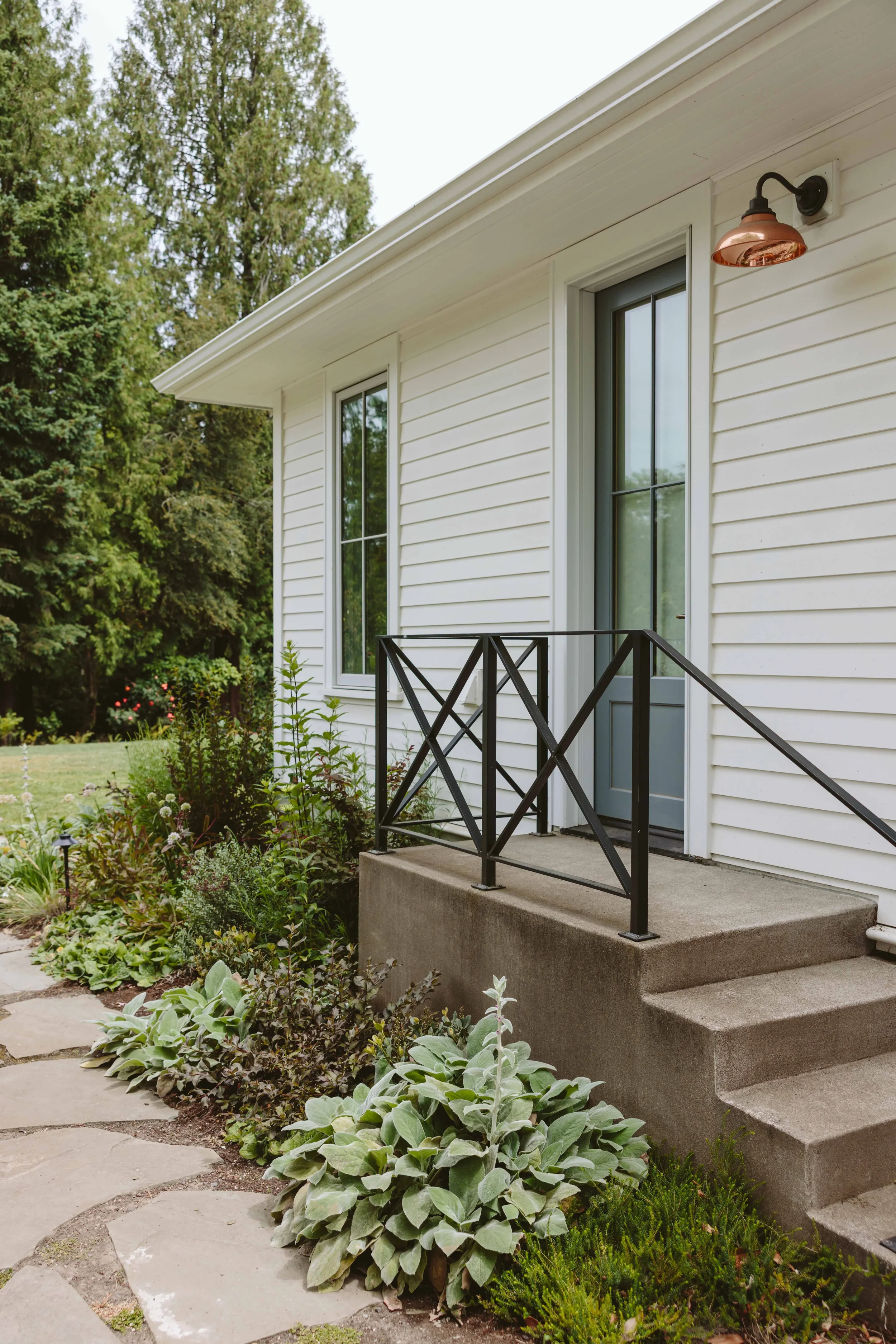 The architect designed a series of porches that funnel light into the house while providing sheltered outdoor space and multiple access points to the garden. Durable concrete stairs were chosen for Portland’s rainy climate with a simple black railing we designed in collaboration with Emily that mimics the geometry of the windows.