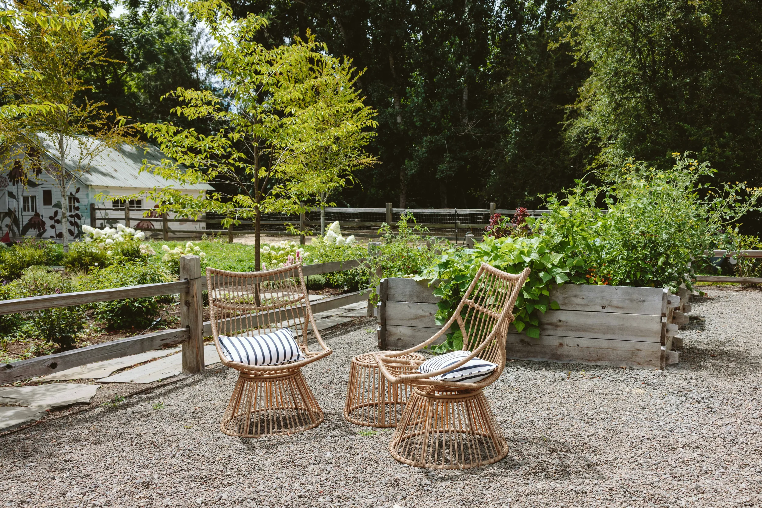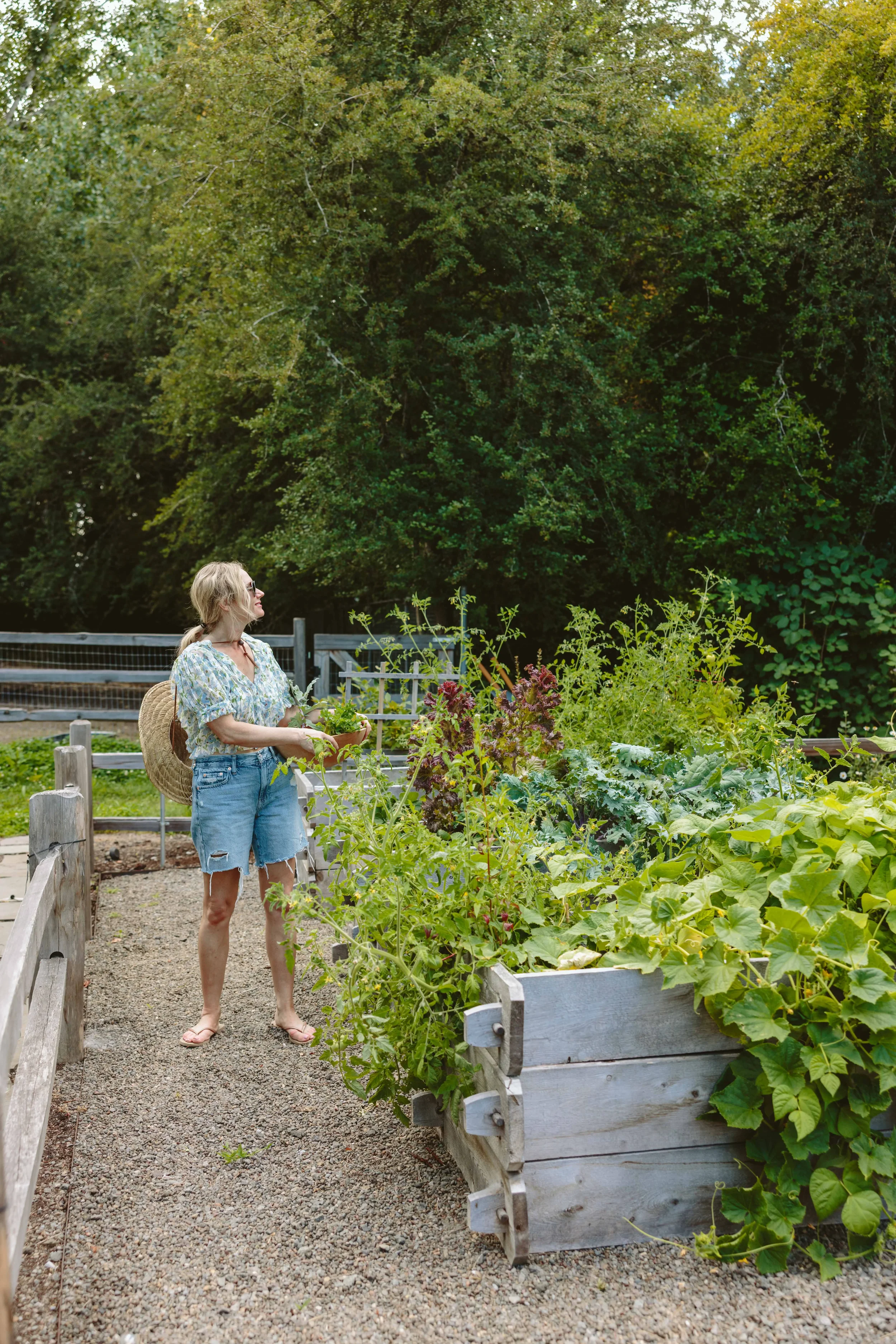 A salad garden (Emily’s term) was added into a pea gravel patio with an outbuilding to house the couple’s fitness equipment. The production gardens are adjacent to the pig and alpaca paddocks, whose occupants happily eat the cuttings.